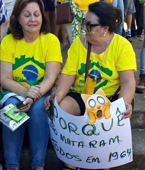 No Brasil, é visto com naturalidade — graça, até — uma senhora segurando um cartaz lamentando que Dilma não tenha sido executada pelo Doi Codi, outro perguntando “por que não mataram todos em 1964?”, entrou outros absurdos.