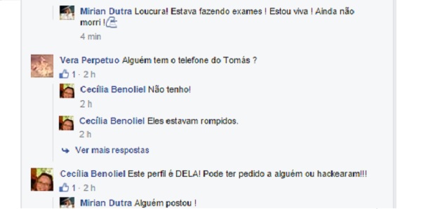 Alguém invadiu seu Facebook. “Loucura! Estava fazendo exames! Ainda não morri!”, escreveu a jornalista. “Alguém postou”.
