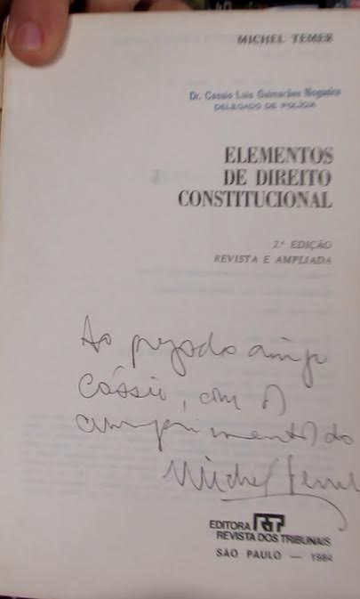 A dedicatória do autor e professor de Direito Constitucional nada tem de especial, foi tipo padrão: “Ao prezado amigo Cássio, com os cumprimentos do Michel Temer”.