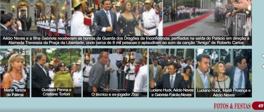 Na mesma edição da revista, Aécio é retratado em outra solenidade, a de transmissão do cargo de governador para Antonio Anastasia. Numa das fotos, um Aécio sorridente está ao lado do amigo Luciano Hulk e da atriz Maitê Proença.