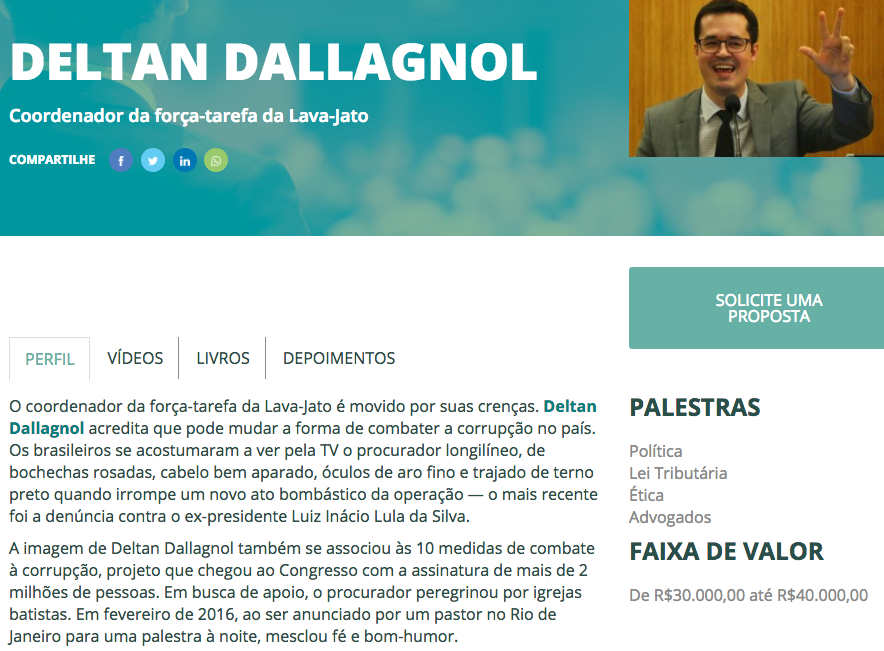 Ao invés disso, Dallagnol vai faturando. Suas palestras são vendidas por um cachê entre 30 e 40 mil reais, como se vê num site que o agencia juntamente com Ana Paula Padrão, Caio Ribeiro, Família Schürman, entre outros.